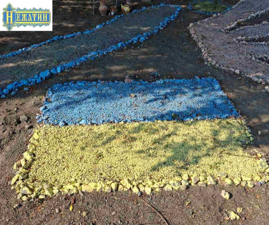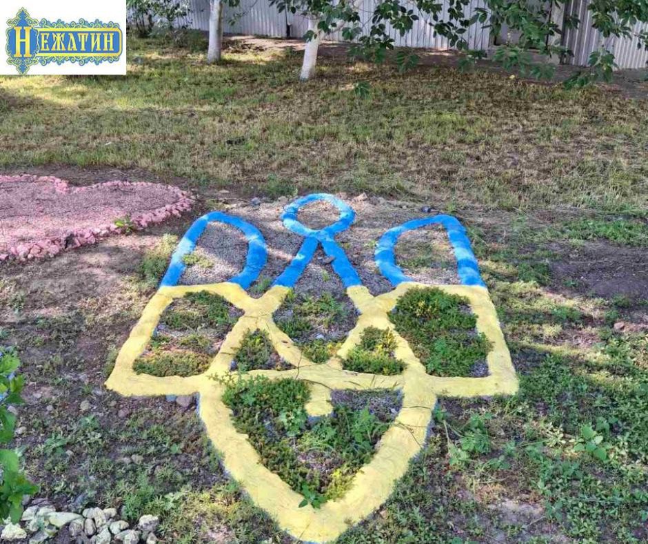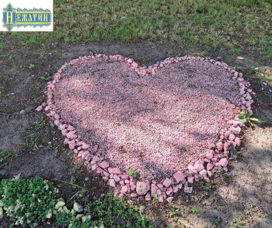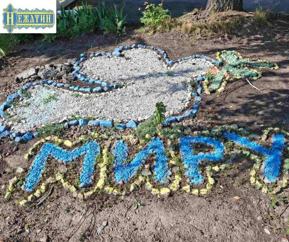 Неймовірно гарні і затишні куточки створили небайдужі мешканці біля однієї з багатоповерхівок на вулиці Незалежності у Ніжині. Не можливо не зупинитись, коли проходиш повз цю красу. Куточки не тільки затишні – вони несуть патріотичне навантаження: автори ідеї виклали з різнокольорових камінців тризуб, синьо-жовтий прапор і голуба, під яким побажали миру кожному перехожому. Нині, під час війни, дане побажання має особливе значення…