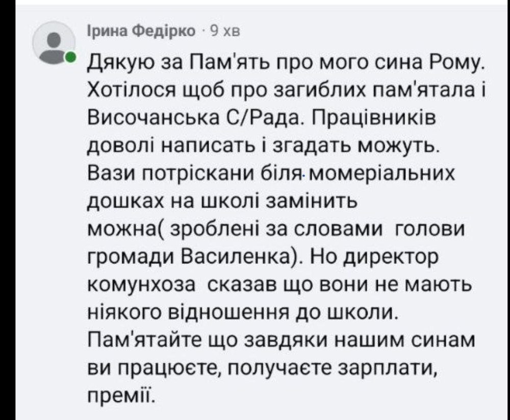 Зі слів небайдужих жителів, керівництво громади рідко згадує або публічно відзначає річниці загиблих воїнів. Рік, два чи три минуло — пам’ятні слова зникають, лишається лише тиша. Відкрили дошку, висловили співчуття — і забули.