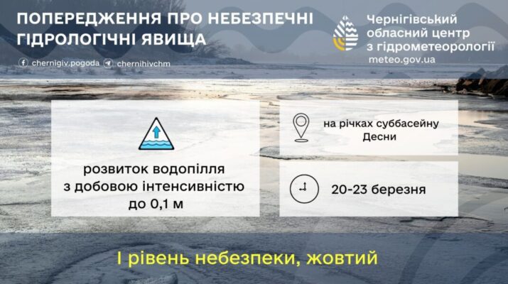 На річках Чернігівщини триває активний розвиток весняного водопілля. Зокрема, на річці Десна спостерігається руйнування льодового покриву, місцями вже розпочався льодохід. Рівень води щодоби підвищується