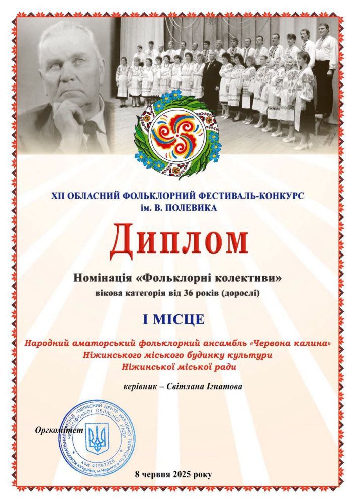 Ніжинський народний аматорський фольклорний ансамбль «Червона калина» вкотре підтвердив свій високий рівень, здобувши перемогу на ХІІ обласному фольклорному фестивалі-конкурсі імені Василя Полевика!