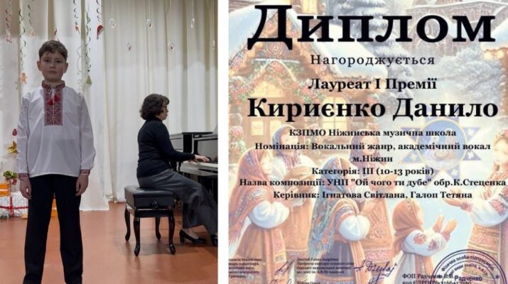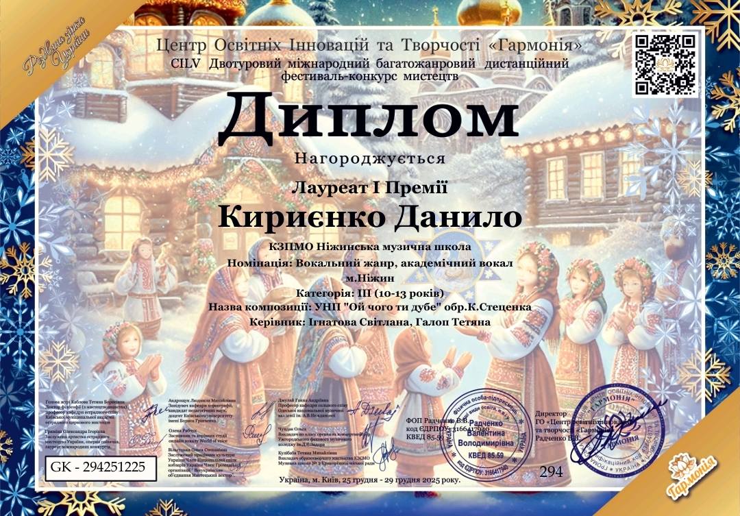 Вітаємо Кирієнка Данила з блискучою перемогою — здобуттям І премії та звання лауреата Міжнародного багатожанрового фестивалю-конкурсу мистецтв «Різдвяна зірка України» у номінації «вокальний жанр» (академічний вокал).