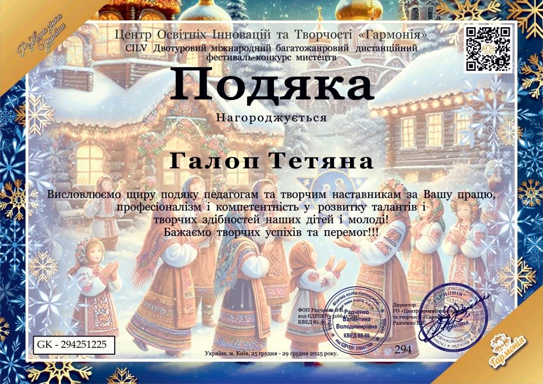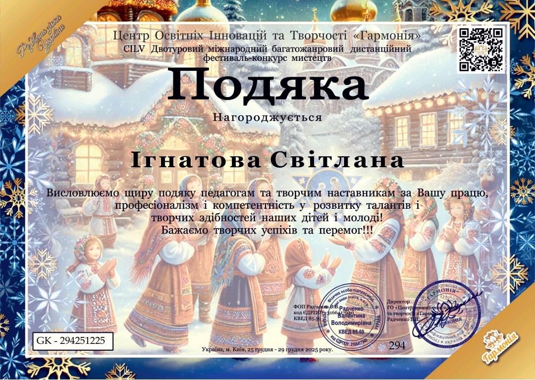 Щира подяка за професійну підготовку викладачу — Ігнатовій Світлані Юріївні та концертмейстеру — Галоп Тетяні Юріївні. Бажаємо Данилу натхнення, нових творчих звершень і подальших перемог!