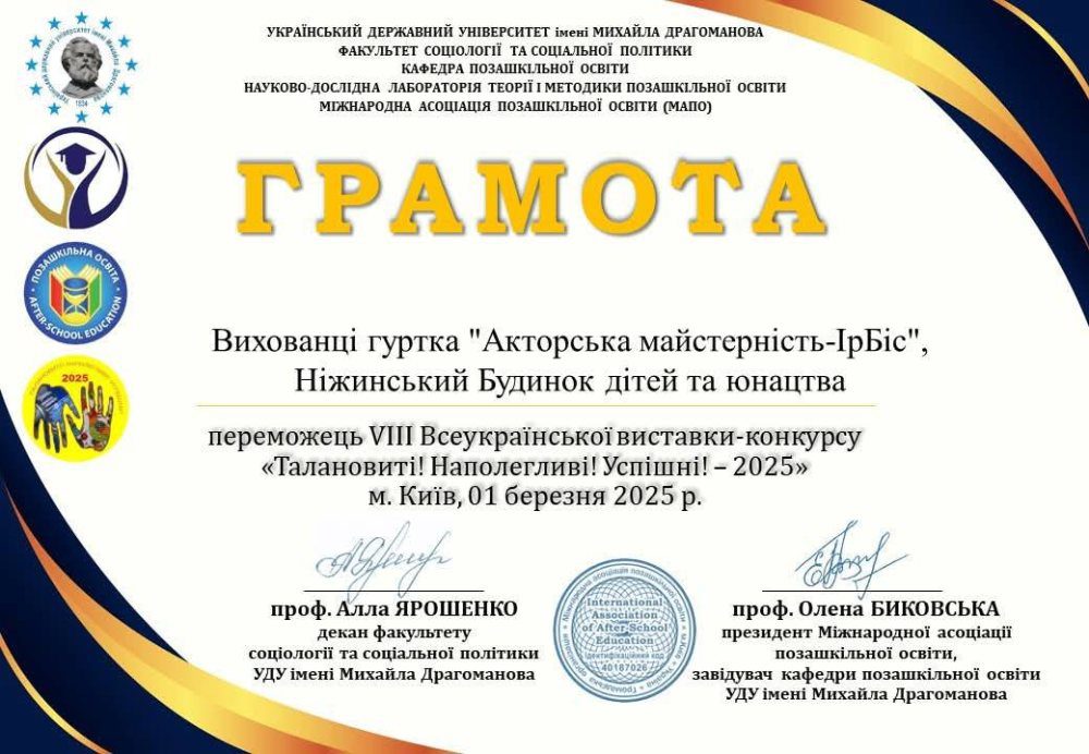 Організаторами виступили Український державний університет імені Михайла Драгоманова, кафедра позашкільної освіти, науково-дослідна лабораторія позашкільної освіти та Міжнародна асоціація позашкільної освіти. Мета конкурсу — підтримка талановитих дітей та молоді, популяризація їх творчості, професійна орієнтація та стимулювання до самореалізації. Цього року на конкурс надійшло 9 916 заявок! Серед учасників були й вихованці гуртків “Акторська майстерність-ІрБіс” та “Ігротехніки” Ніжинського Будинку дітей та юнацтва під керівництвом Ірини Наконечної.