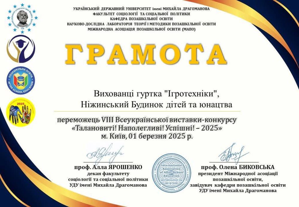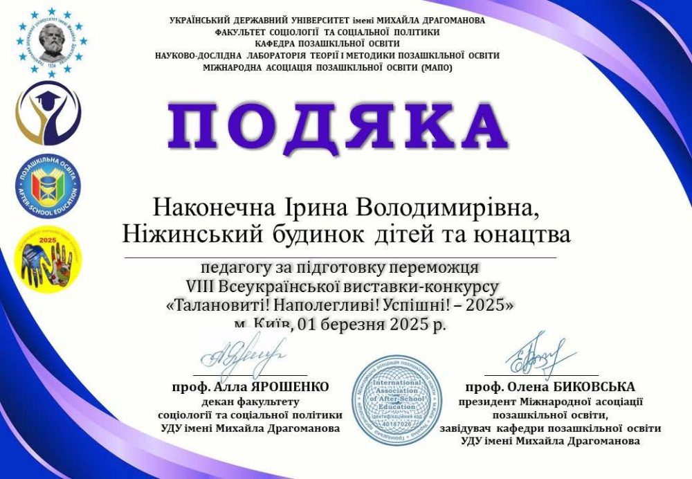 VIII Всеукраїнська виставка-конкурс «Талановиті! Наполегливі! Успішні! – 2025» (м. Київ) відбулася з 15.01.2025 по 28.02.2025.