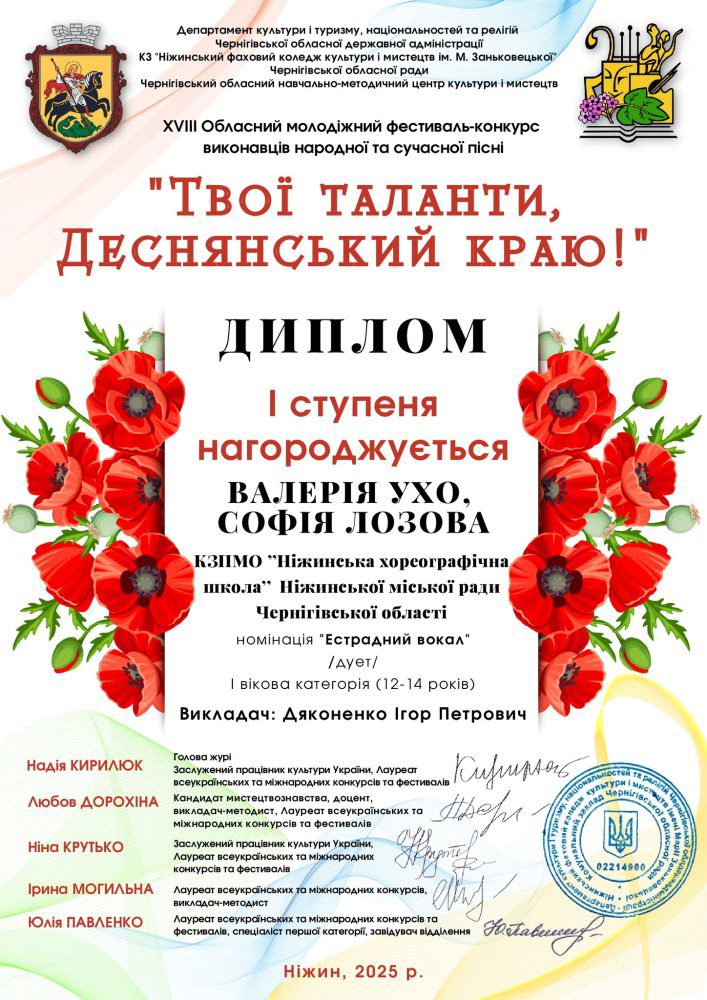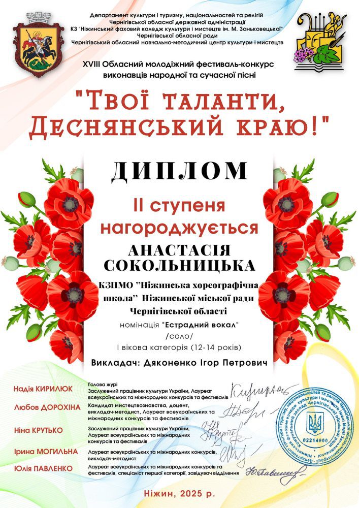 ВІТАЄМО ПЕРЕМОЖЦІВ! Лауреатів XVIII Обласного молодіжного фестивалю-конкурсу виконавців народної та сучасної пісні “ТВОЇ ТАЛАНТИ, ДЕСНЯНСЬКИЙ КРАЮ!” 2025 р.