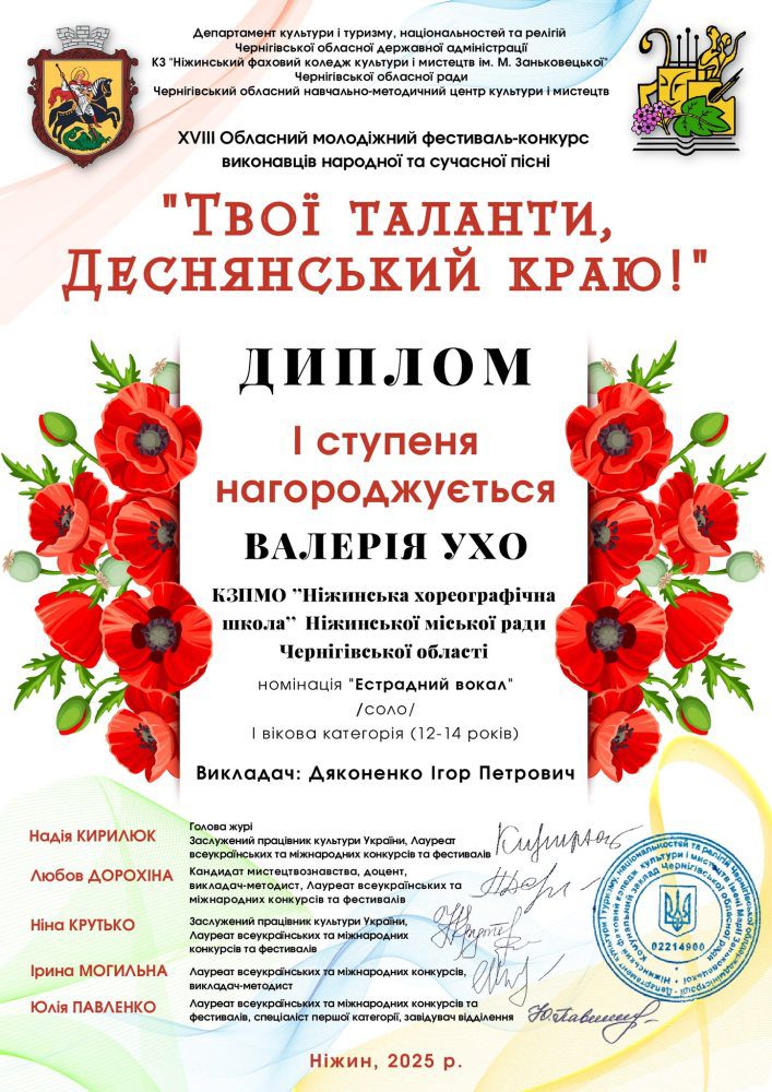 - ВАЛЕРІЮ УХО Лауреатку І ступеня у номінації “Естрадний вокал” (соло)