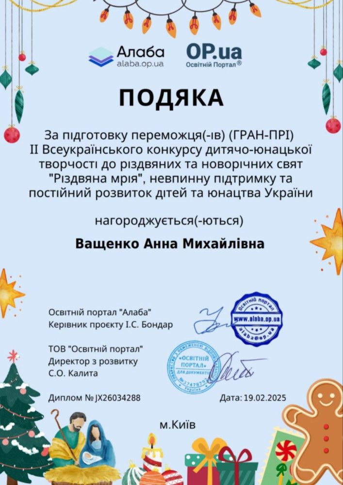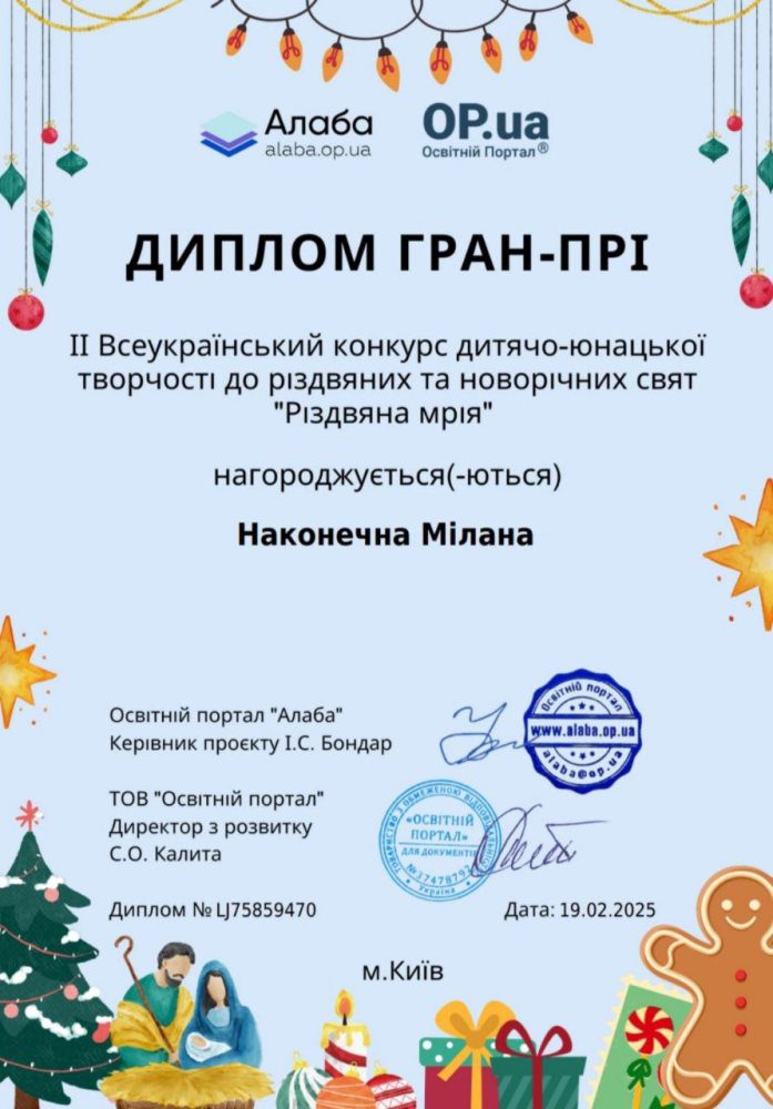 Мілана здобула ГРАН-ПРІ у ІІ Всеукраїнському конкурсі дитячо-юнацької творчості “Різдвяна мрія”! Серед майже 1200 творчих робіт з усієї України її мистецька майстерність та креативність отримали найвищу нагороду!