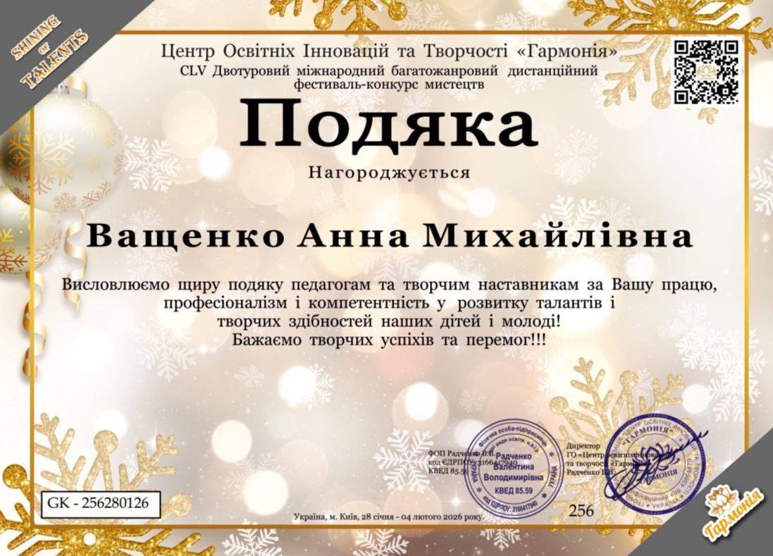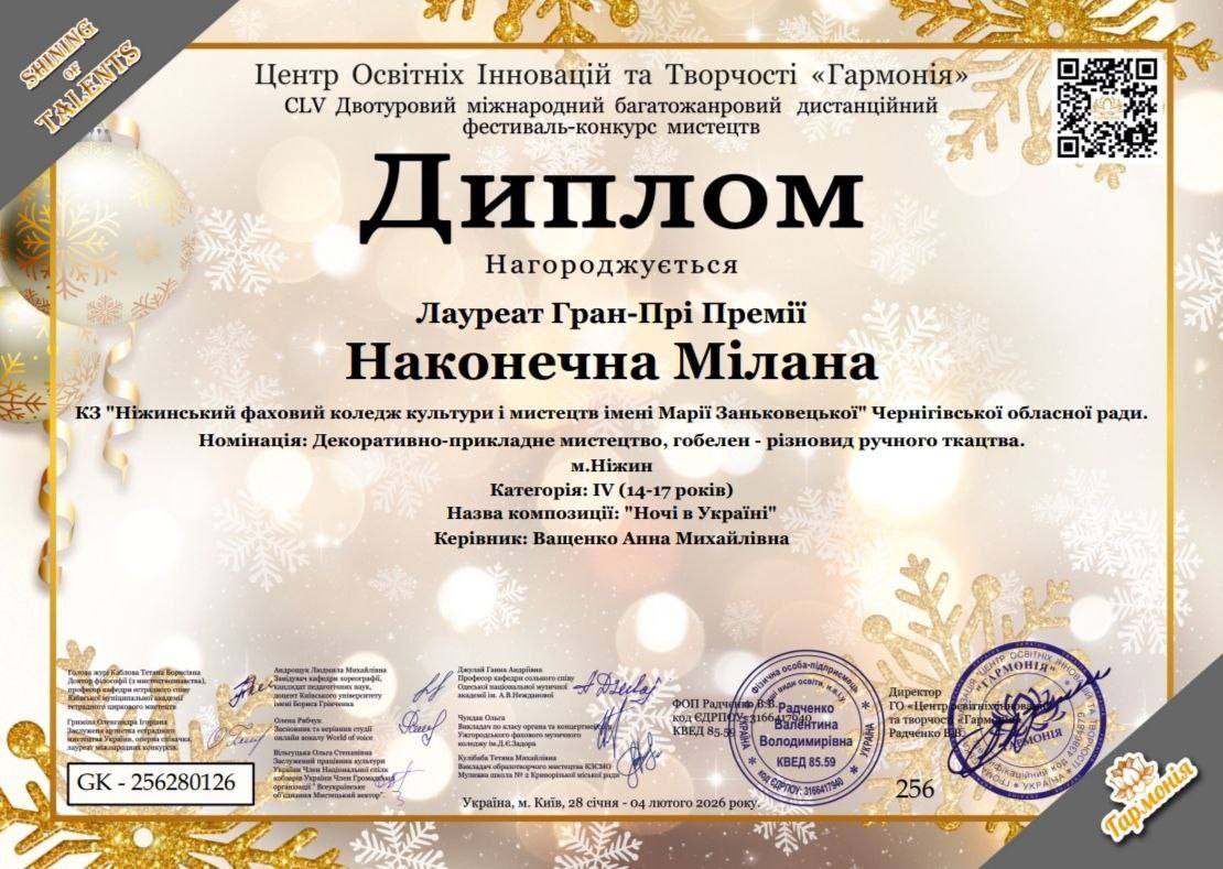 Молода мисткиня виборола Гран-Прі Премії CLV Двотурового міжнародного багатожанрового дистанційного фестивалю-конкурсу мистецтв, організованого Центром освітніх інновацій та творчості «Гармонія».