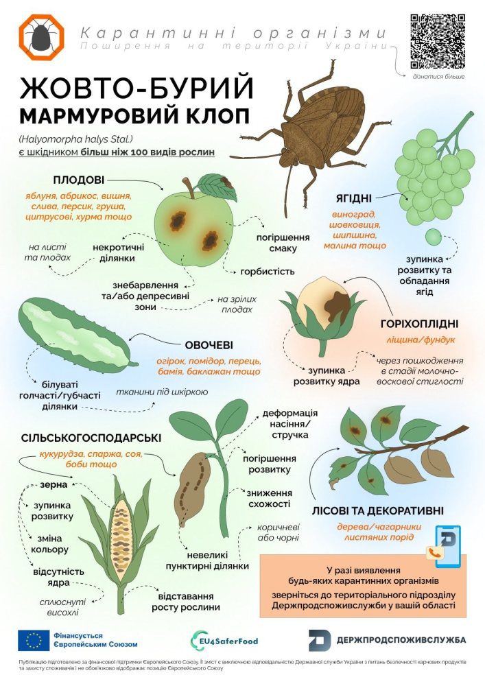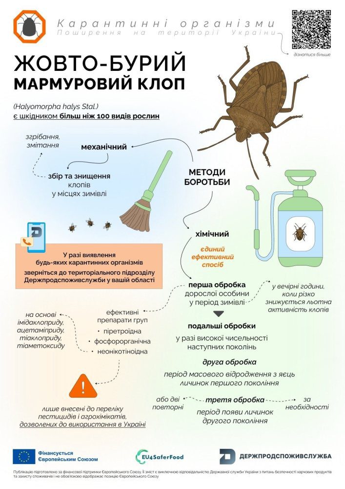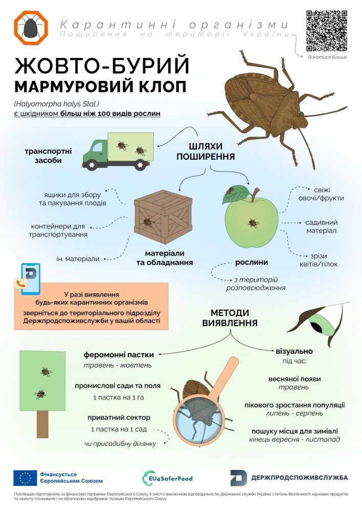 У співпраці з європейським проєктом EU4SaferFood створено інформаційні брошури, де зібрано всю актуальну інформацію про виявлення, шляхи розповсюдження та методи боротьби з жовто-бурим мармуровим клопом.
