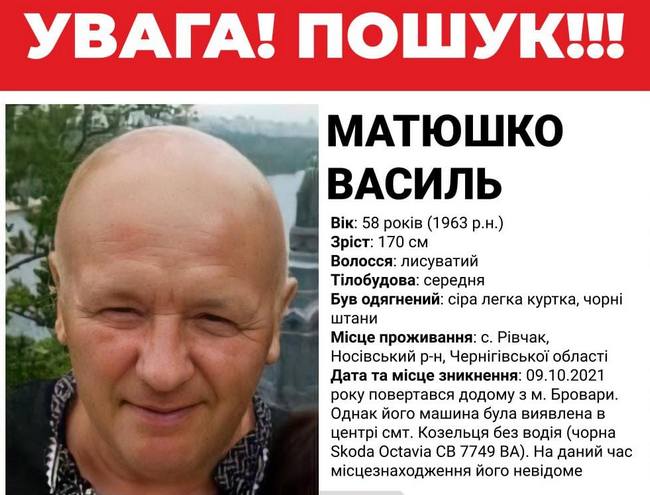 Вранці 8 жовтня 58-річний Василь Матюшко з села Рівчак-Степанівки Макіївської ТГ (Носівщина) власним автомобілем поїхав продавати молочні продукти в Бровари. По обіді мав повернутися додому, однак зв’язок з ним обірвався.