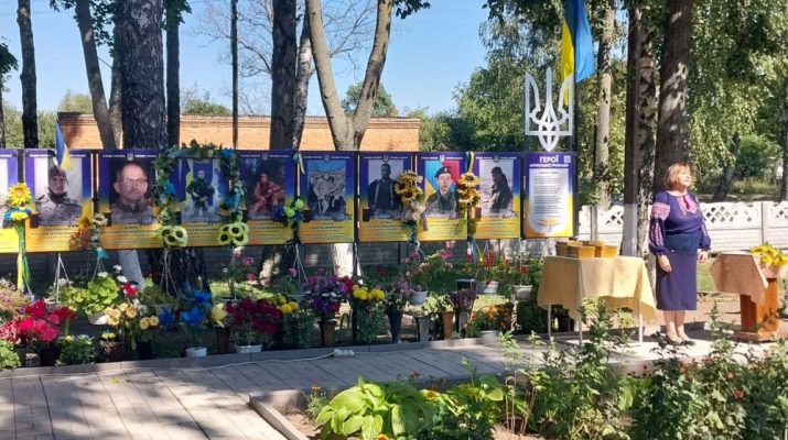 Родини схилилися у скорботі та поклали квіти до портретів Героїв. Діти у національному вбранні прикріпили рідним загиблих власноруч виготовлені соняшники, всередині яких було фото Героя.