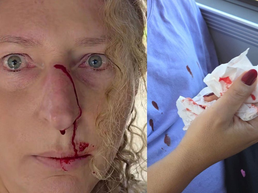“Я встала між ним і моєю подругою, щоб він не міг вирвати телефон. І тоді він наблизився і вдарив мене головою у ніс. Одразу ж потекла кров”, – згадує жінка.