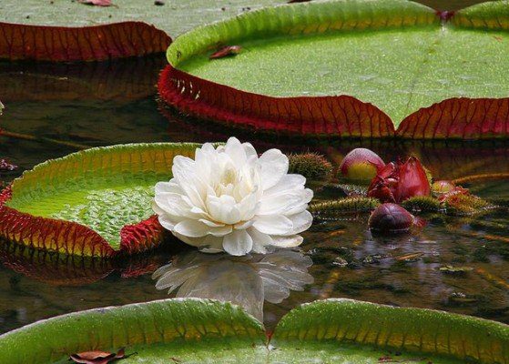 Квітка вікторії амазонської — це окрема магія. Вона розкривається лише вночі: у першу ніч — білосніжна, у другу — ніжно-рожева, а на третю стає фіолетовою або пурпуровою. Така зміна кольору символізує завершення її короткого, але яскравого життя.
