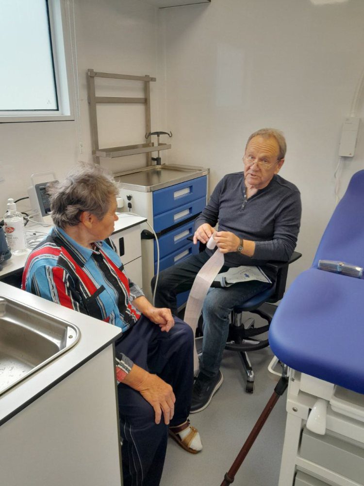 Прийом проводять сімейний лікар і медсестра. Стандартна процедура — кардіограма, вимірювання тиску, загальний медичний огляд. В наявності ліки для надання невідкладної допомоги. Завдання медпрацівників мобільного пункту — зорієнтувати людину і в разі потреби направити до багатопрофільних фахівців.