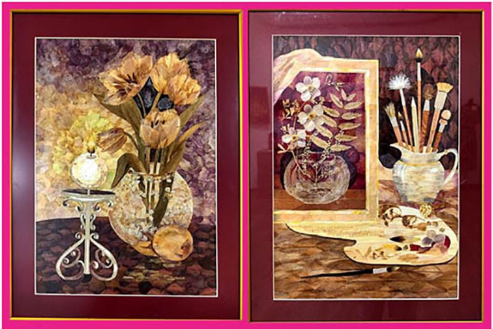 – Великі роботи створюються більше місяця. Але сама підготовка — засушування — ще довша. Раніше я працювала на папері, зараз — на міцнішій основі, на полотні. Спершу роблю олівцеві ескізи, продумую композицію, підбираю рослини. Для передачі фактури дерева чи скла використовую різні природні матеріали. Робота йде поетапно: фон, стіл, ваза — і лише в останню чергу букет.