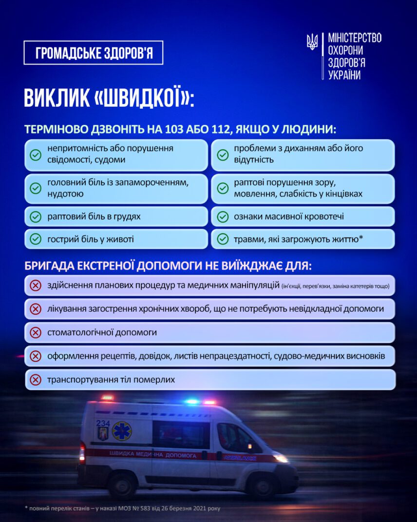 Підстави, за яких бригада екстреної медичної допомоги виїздить на виклик, визначені наказом МОЗ № 583 від 26 березня 2021 року: https://tinyurl.com/y2vtnze8.