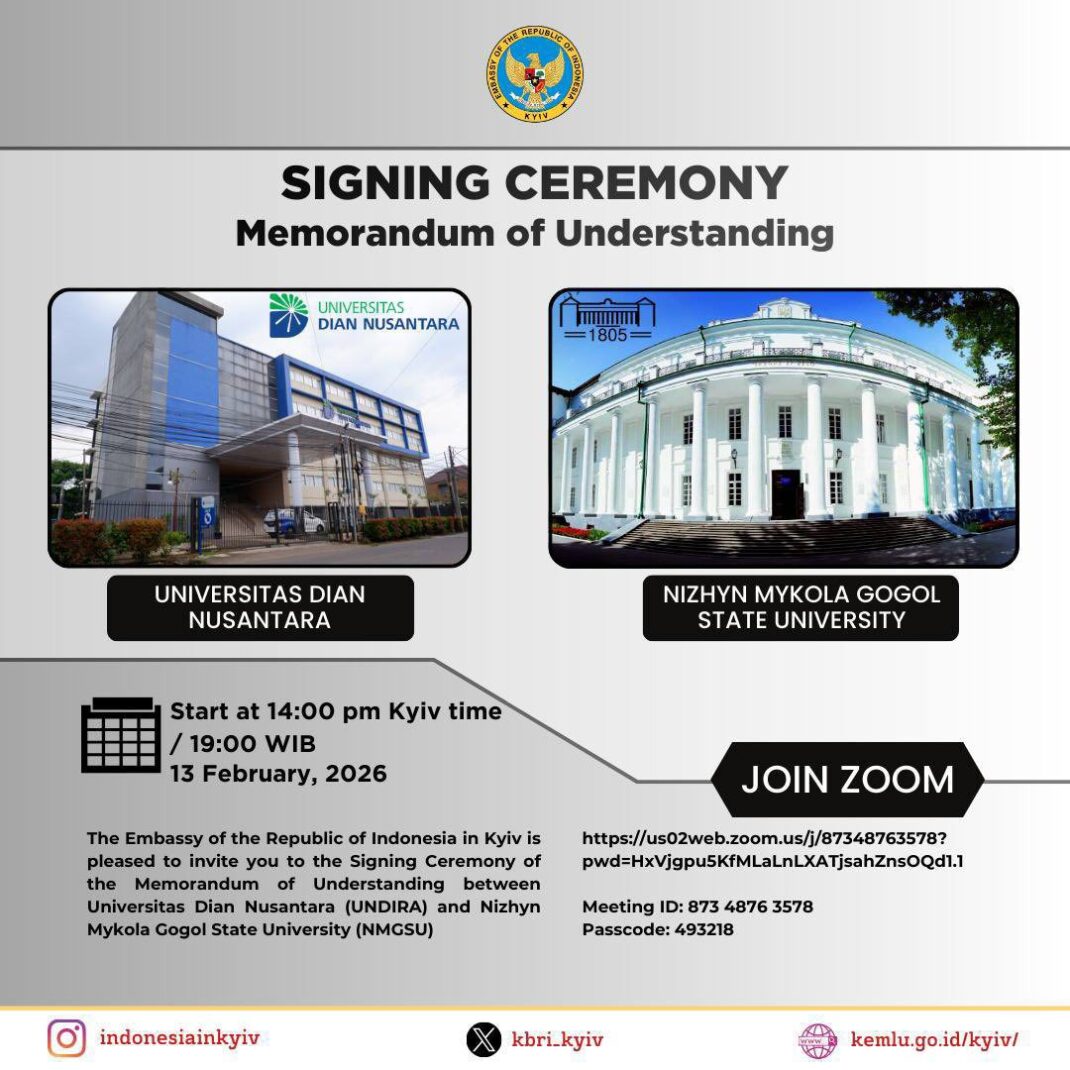 13 лютого 2025 року відбулася урочиста церемонія підписання Меморандуму про взаєморозуміння між Ніжинський державний університет імені Миколи Гоголя та Universitas Dian Nusantara (Індонезія).