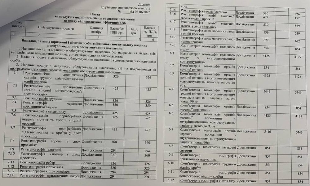 Ціни коливаються від 294 грн (рентгенографія ключиці) до 5446 грн (комп’ютерна томографія органів грудної клітини з внутрішньовенним контрастуванням пацієнту вагою понад 90 кг.