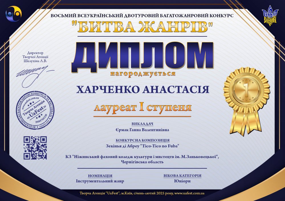 Ніжинський фаховий коледж культури і мистецтв імені Марії Заньковецької вітає Харченко Анастасію – здобувачку освіти ІІ курсу спеціальності 028 Менеджмент соціокультурної діяльності (вокальне мистецтво, естрадний спів) – з І місцем у Восьмому всеукраїнському двотуровому багатожанровому конкурсі “Битва жанрів“!
