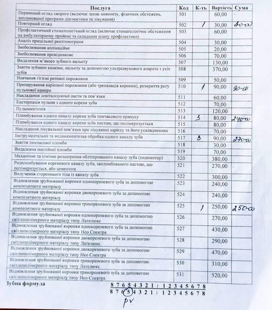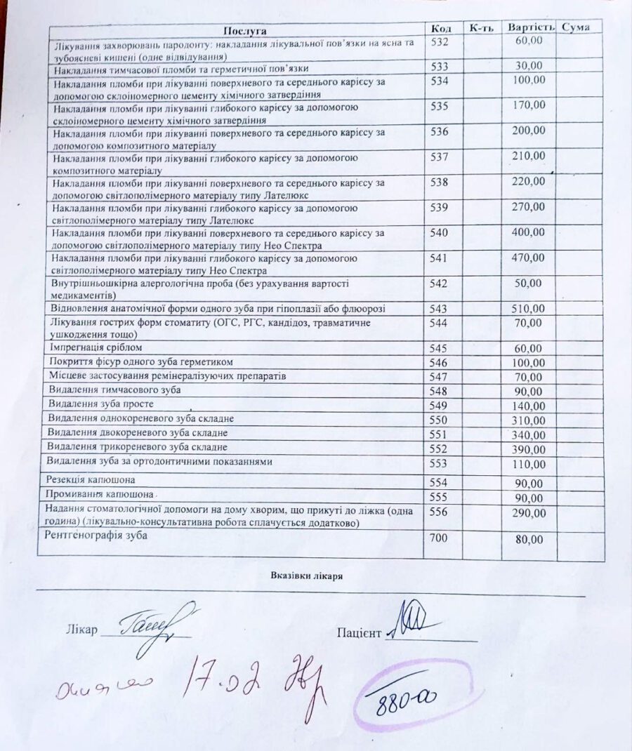 Через тиждень відбувся повторний прийом, під час якого лікування завершили. Вартість другого візиту становила 880 гривень. Загальна сума лікування молочного зуба склала 1240 гривень.