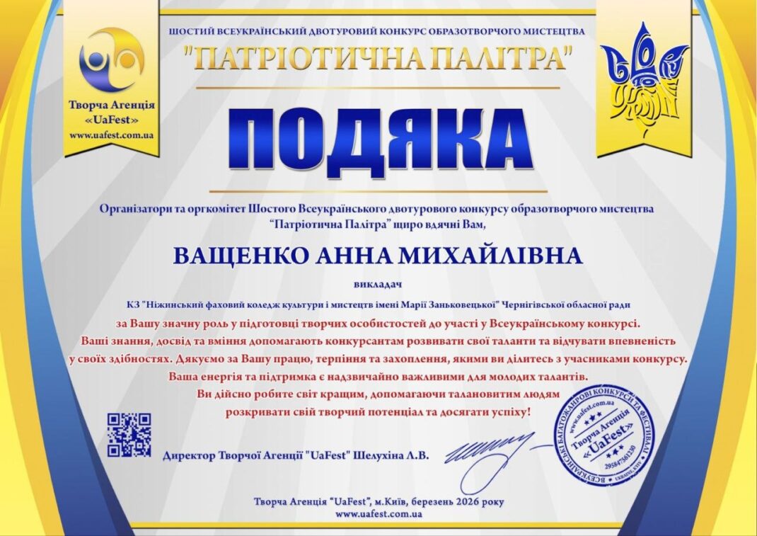 Ще одне досягнення — лауреатка ІІ ступеня на Шостому всеукраїнському двотуровому конкурсі образотворчого мистецтва «Патріотична палітра». Тут мисткиня представила роботи «Воля» та «Покрова», виконані у техніці гуаші. Участь у цьому конкурсі проходила під наставництвом викладачки та кураторки Анни Михайлівни Ващенко.