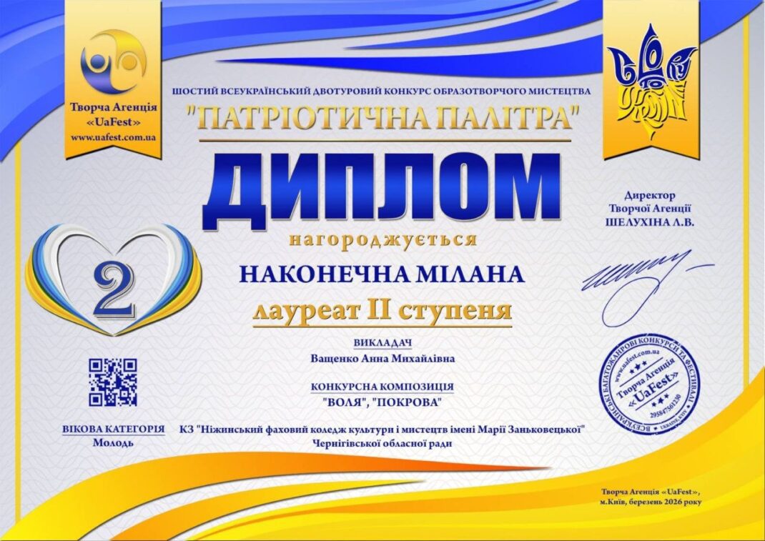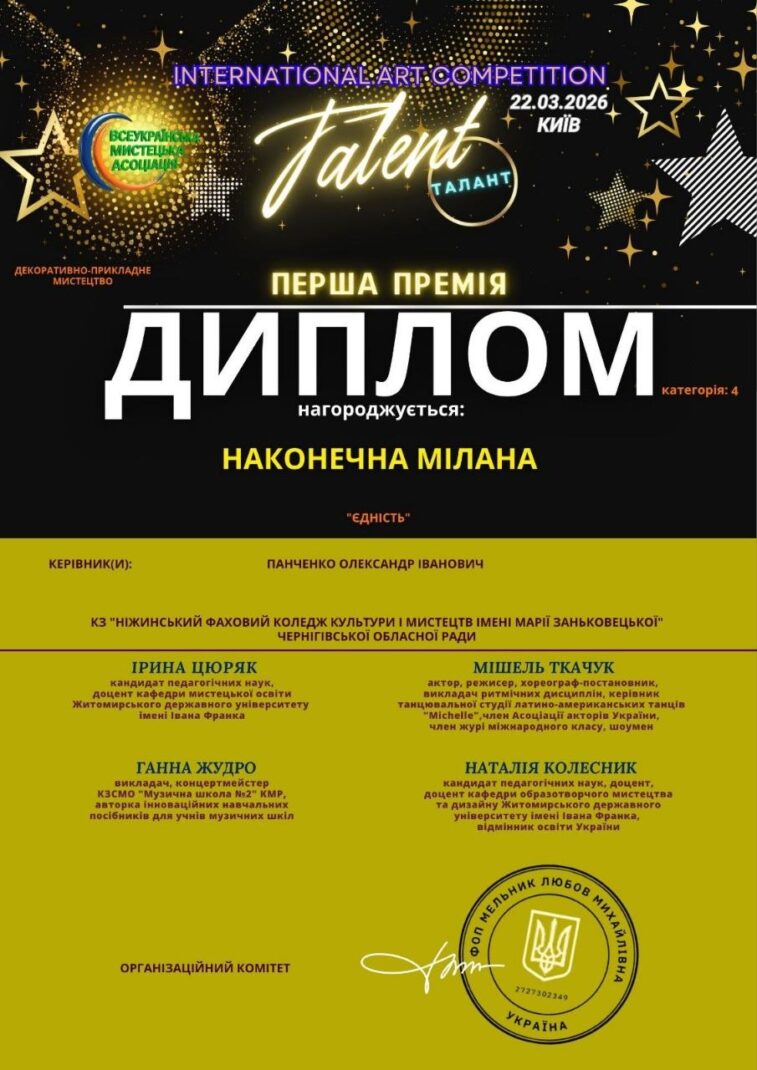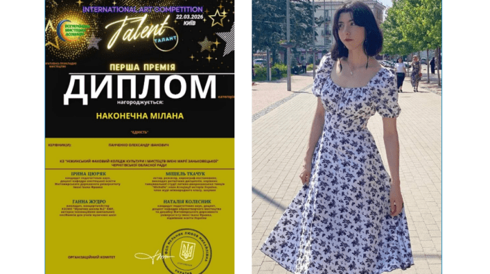 Студентка 3 курсу спеціальності «Декоративно-прикладне мистецтво» Ніжинського фахового коледжу культури і мистецтв ім. Марії Заньковецької Мілана Наконечна вкотре підтвердила свій талант і високий рівень майстерності, здобувши відразу дві вагомі перемоги у престижних мистецьких конкурсах.