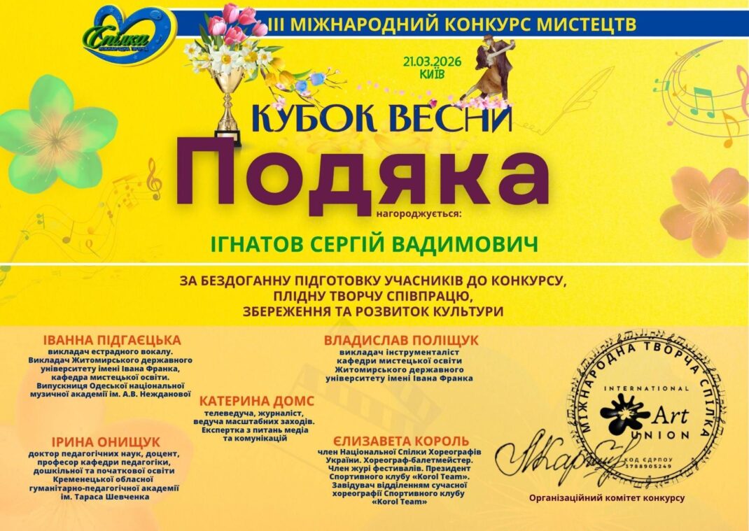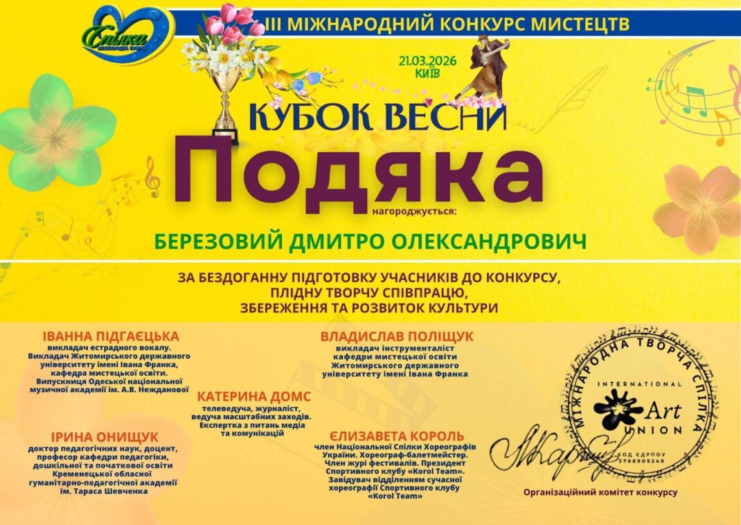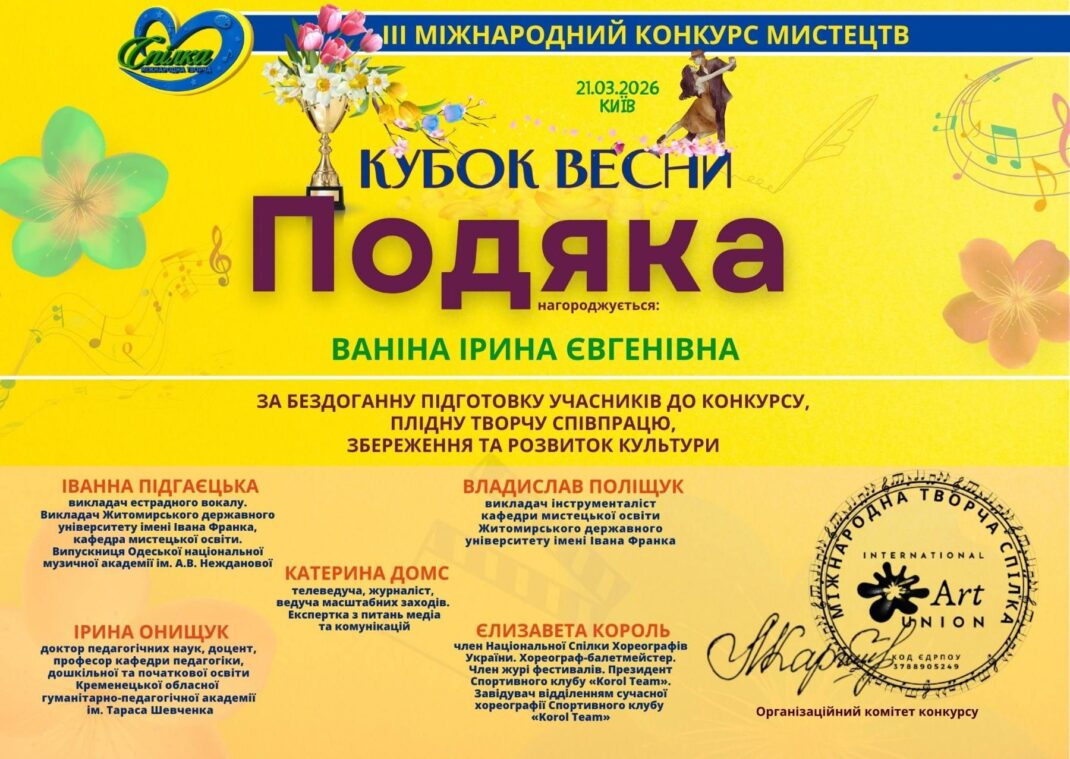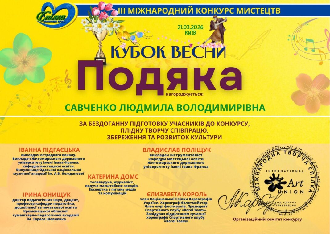 Приємна новина для мистецької спільноти — талановиті виконавці гідно представили себе на ІІІ Міжнародному конкурсі мистецтв «Кубок весни», що відбувся у Києві, та здобули почесні нагороди.