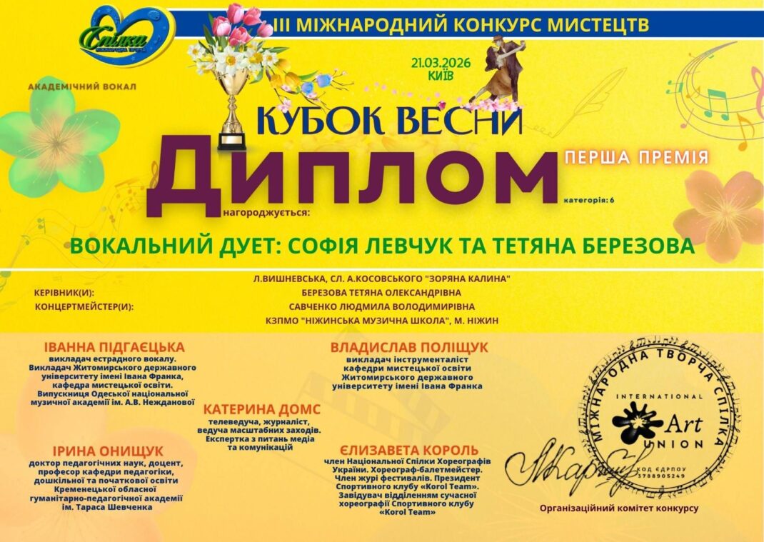 Лауреатами І премії стали вокальний дует у складі Софії Левчук та Тетяни Березової. Їхній виступ вирізнявся гармонійним звучанням, емоційною глибиною та високою виконавською майстерністю. Підготовкою дуету займалася викладачка Тетяна Олександрівна Березова, а концертмейстером виступила Людмила Володимирівна Савченко, чий професійний супровід допоміг розкрити творчий потенціал виконавиць.