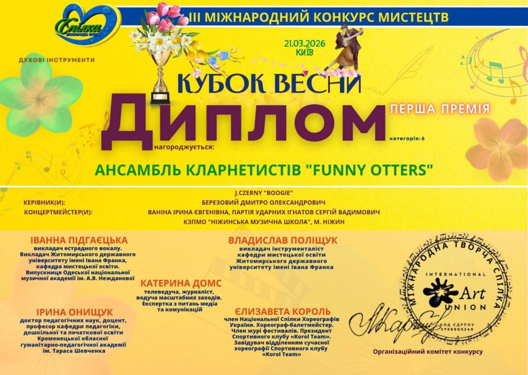 Ще одну перемогу здобув ансамбль кларнетистів «FUNNY OTTERS», який також став лауреатом І премії. Колектив продемонстрував яскраву ансамблеву злагодженість, технічну вправність і сценічну культуру. Керівником ансамблю є Дмитро Олександрович Березовий, концертмейстер — Ірина Євгеніївна Ваніна, а партію ударних виконав Сергій Вадимович Ігнатов.