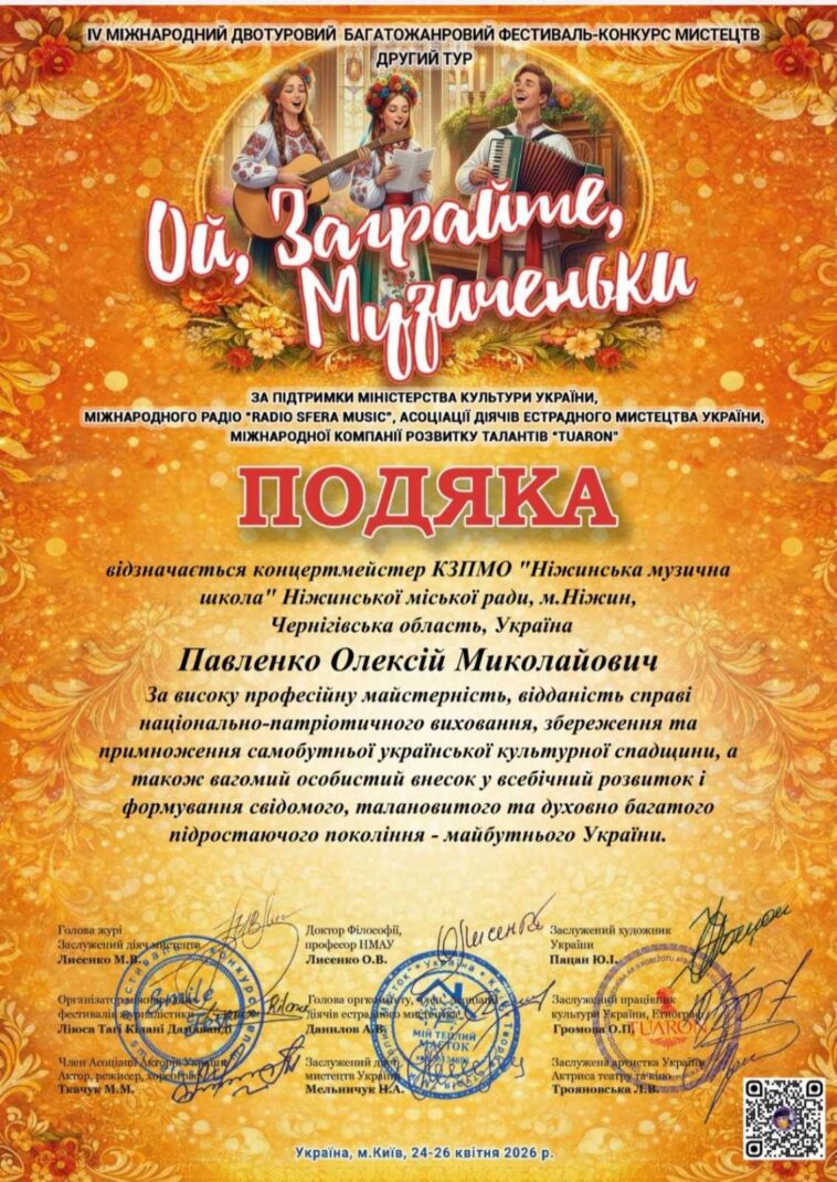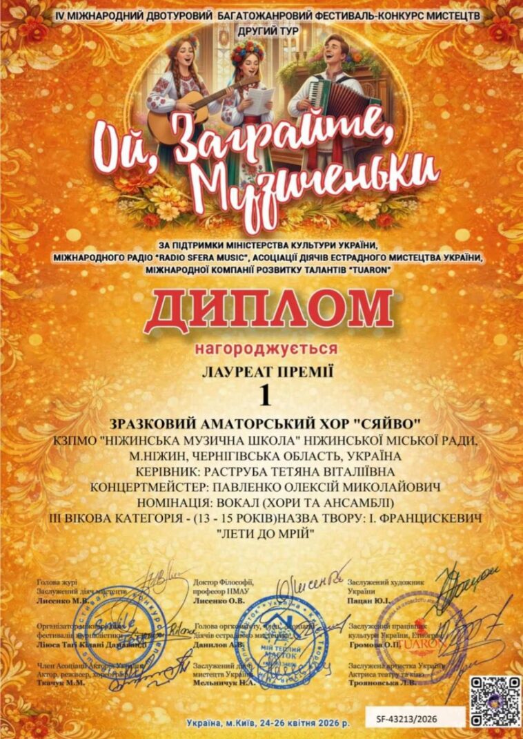 Яскравою сторінкою у мистецькому житті громади стала перемога Зразкового аматорського хору «СЯЙВО», який виборов звання Лауреата І премії на IV Міжнародному двотуровому багатожанровому фестивалі-конкурсі мистецтв «Ой, заграйте, музиченьки». Колектив тріумфував у номінації «вокал, хори та ансамблі» (III вікова категорія), продемонструвавши високий рівень виконавської майстерності, злагодженість звучання та щиру емоційність.