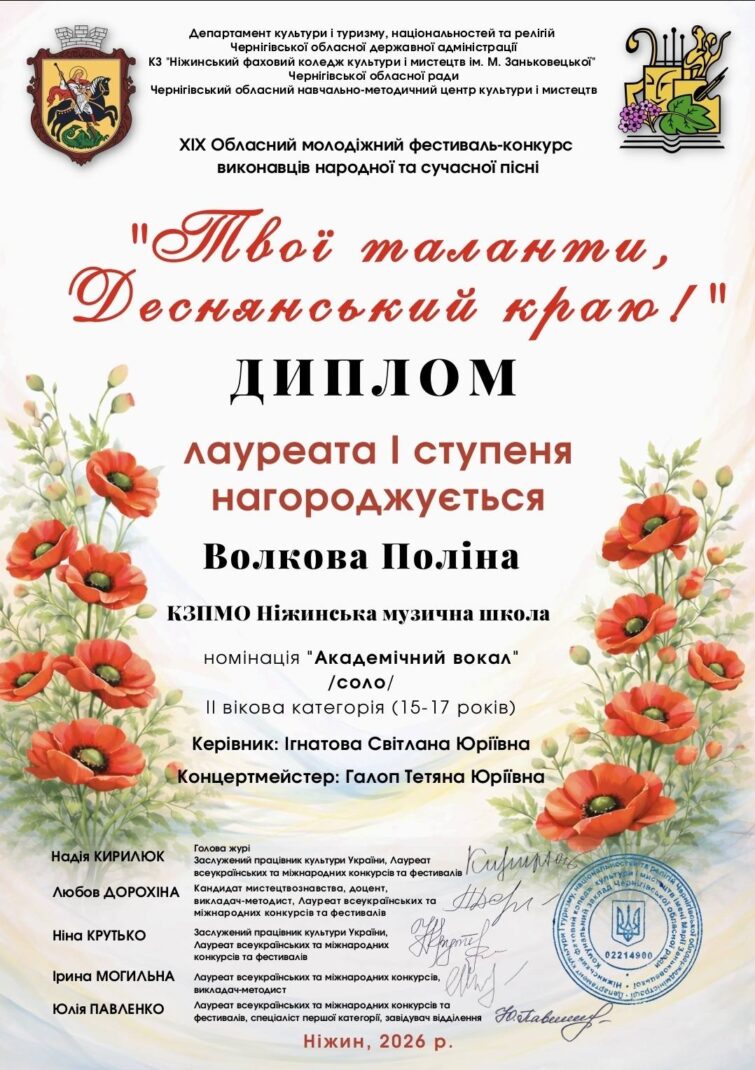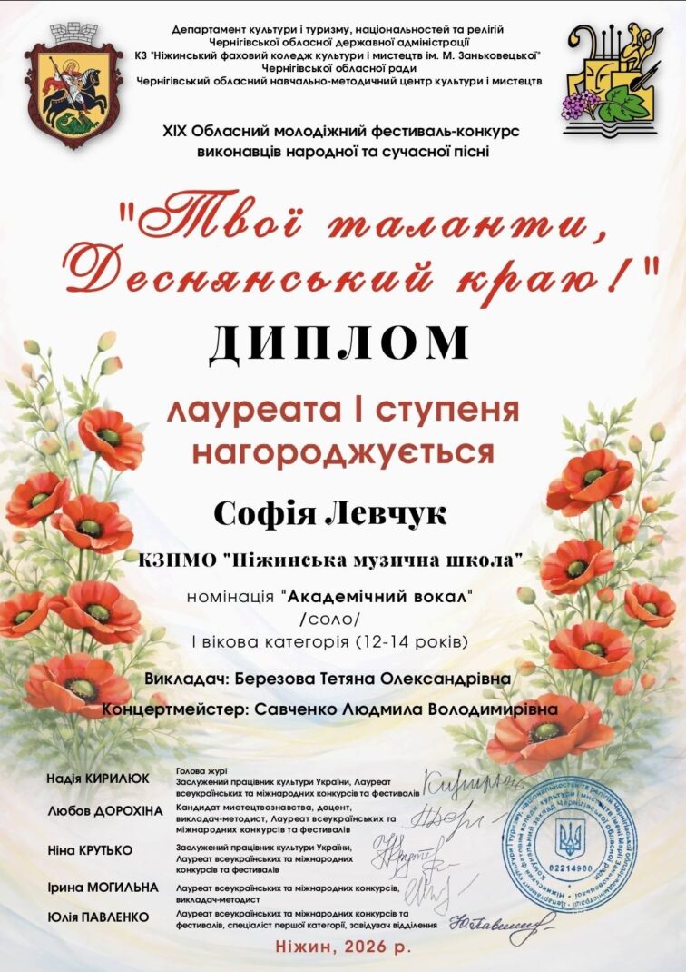 У місті Ніжин відбувся обласний молодіжний фестиваль-конкурс виконавців народної та сучасної пісні «Твої таланти, Деснянський краю!», який об’єднав обдаровану молодь з різних куточків регіону. У номінації «академічний вокал (соло)» блискучу перемогу здобули юні співачки, які гідно представили свій навчальний заклад та рідне місто.