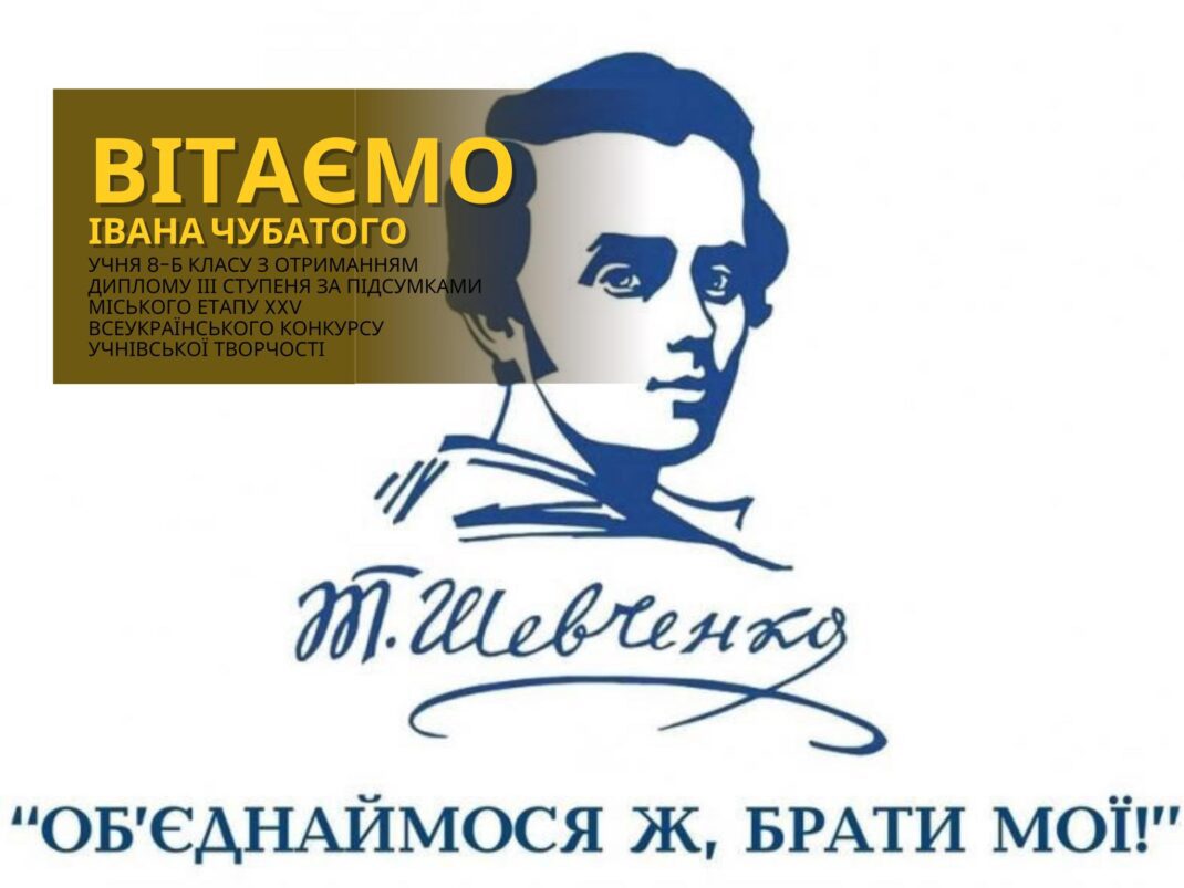 Учень 8-Б класу Ніжинської гімназії № 1 Іван Чубатий став призером міського етапу ХХV Всеукраїнського конкурсу учнівської творчості, що проходить під гаслом «Об’єднаймося ж, брати мої!», здобувши диплом ІІІ ступеня.