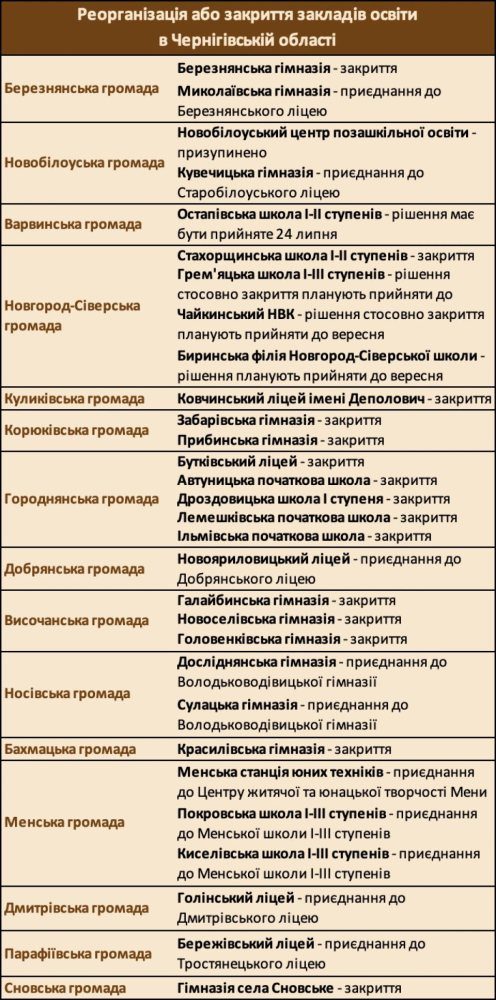 Втім, все наведене тут – є неповним одразу з кількох причин. Наприклад, як нам відповіли у Семенівській громаді, станом на середину липня там не планують закривати школи. Але до вересня все може змінитися, і тоді під закриття потраплять 3 школи та 5 філій: