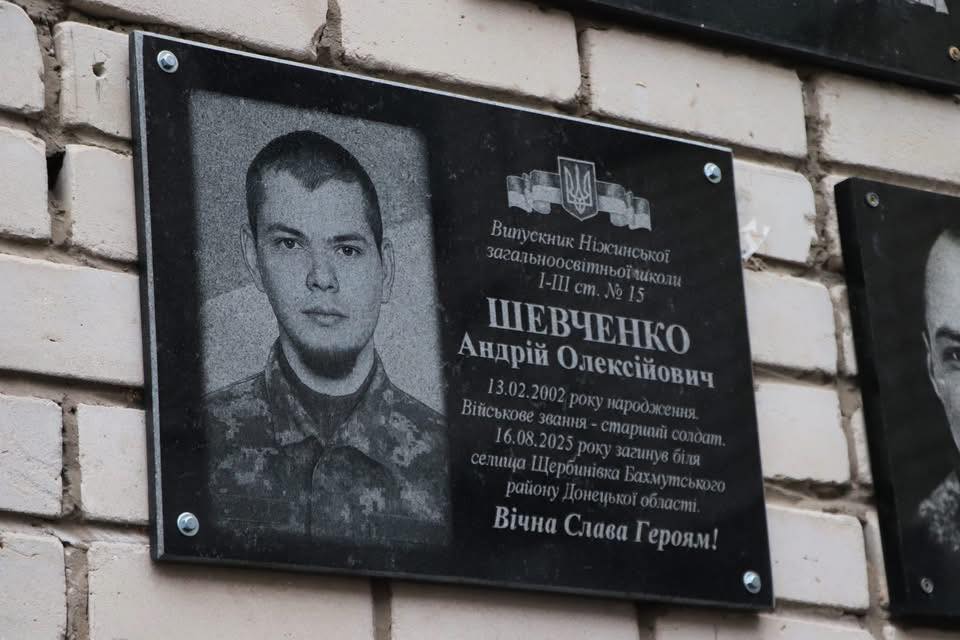 Сьогодні в Ніжинській гімназії №15 «Основа» відбулося урочисте відкриття меморіальної дошки на честь випускника закладу, Шевченка Андрія Олексійовича (13.02.2002 р. н.), який віддав своє життя за незалежність і суверенітет України.