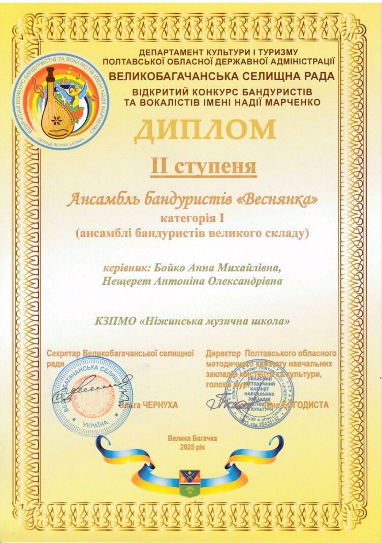 Ансамбль бандуристів «ВЕСНЯНКА» гідно представив Ніжинську музичну школу, здобувши Диплом ІІ ступеня у відкритому спеціалізованому мистецькому конкурсі бандурного та вокального мистецтва імені Надії Марченко.