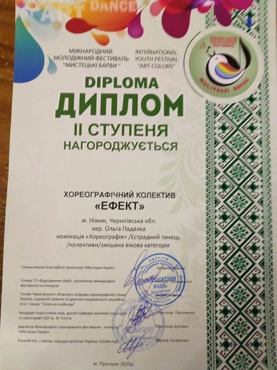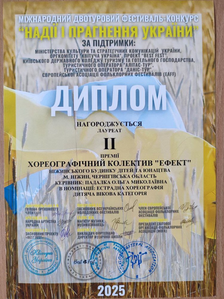 — Колектив був заснований у 2011 році і з перших днів ми ставили перед собою високу планку. Діти наполегливо працювали, і їхні зусилля не залишилися без нагород. “Ефект” неодноразово перемагав у Всеукраїнських та Міжнародних конкурсах, здобував срібні, золоті медалі та ГРАН-ПРІ. Ми не просто виступали, а представляли Ніжин на великій сцені, прославляючи рідне місто.