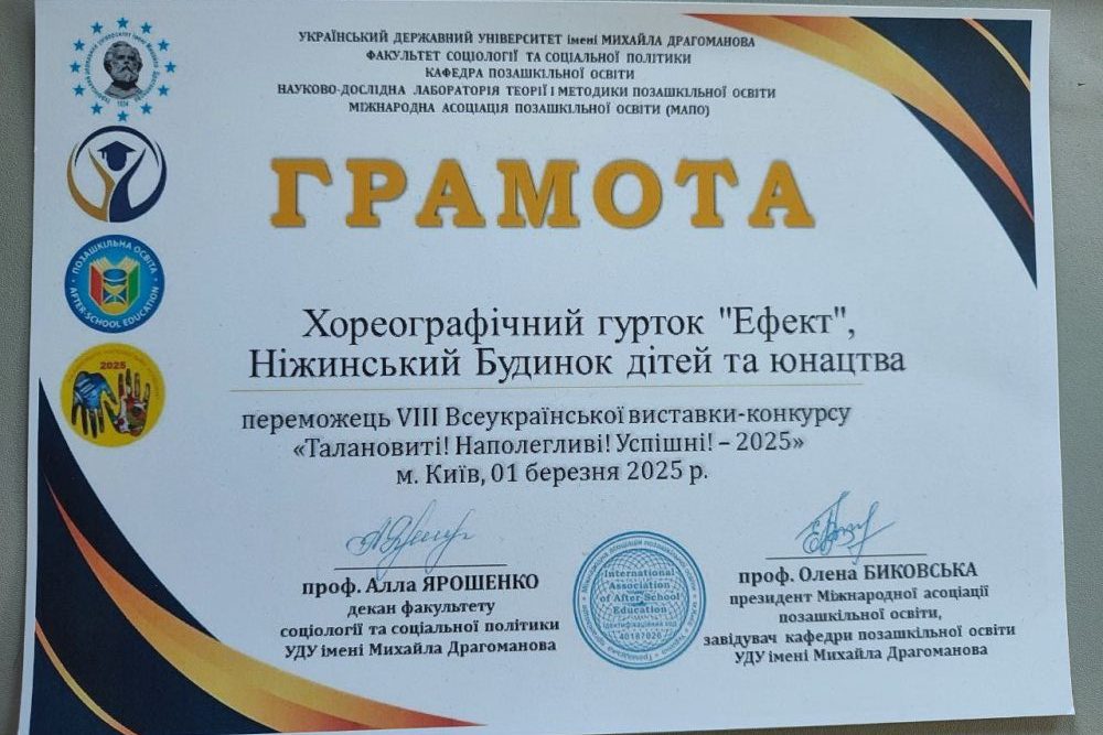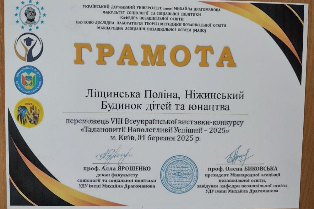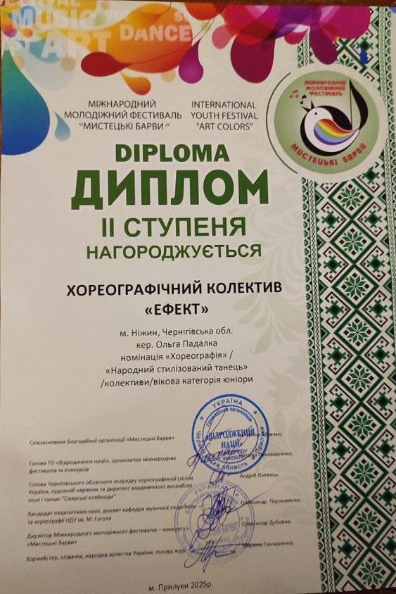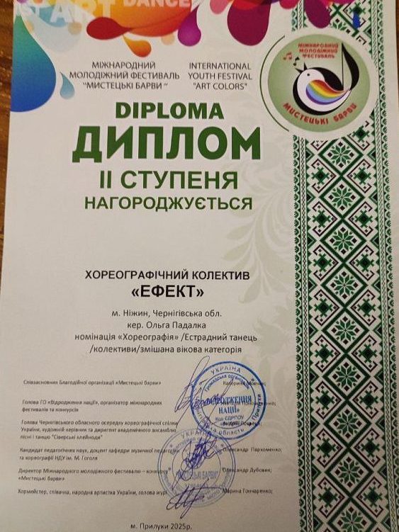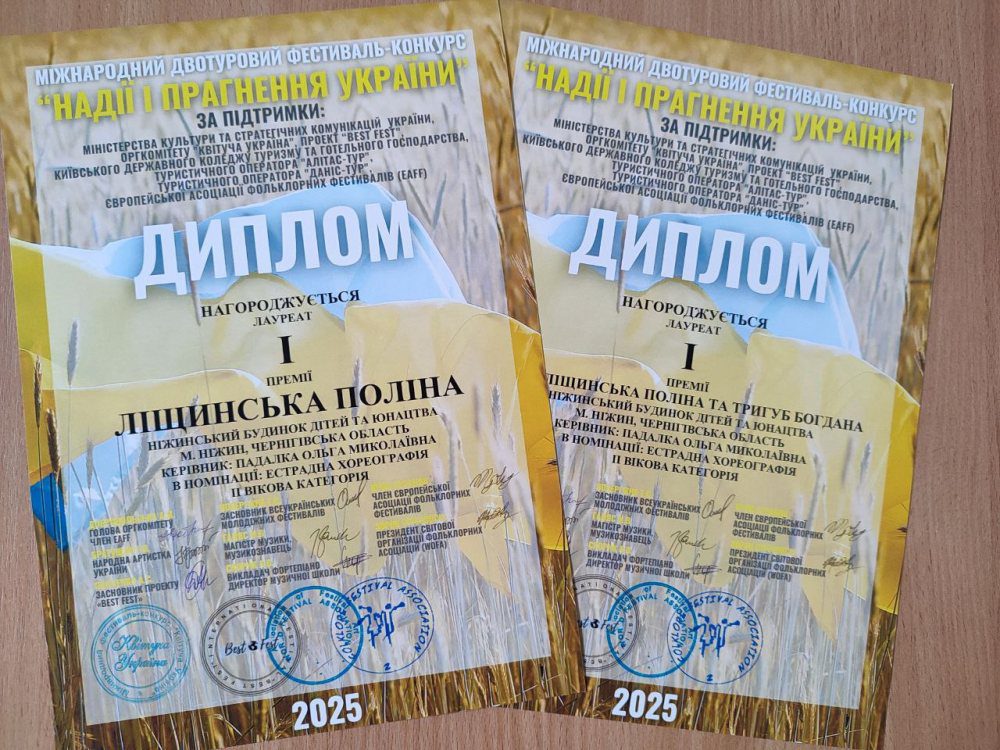 — Так, і наші діти вже встигли здобути перемоги! Ми побували на Всеукраїнському фестивалі мистецтва в Бобровиці, взяли участь у Міжнародних конкурсах у Чернігові та Прилуках, де здобули перші та другі місця. Найголовніше досягнення — ГРАН-ПРІ на Всеукраїнському конкурсі “Квітуча Країна 2025” у Києві! Ми пишаємося нашими вихованцями!