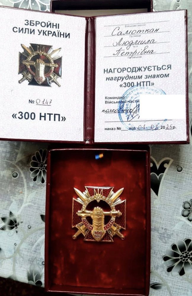 Особливу відзнаку — нагородний знак “300 НТП” — було вручено директорці сільського будинку культури Людмилі Самоткан. Її внесок у волонтерську справу став прикладом натхнення для всієї громади. Кожна маскувальна сітка, кожен вузлик, вплетений руками волонтерів — це не матеріал, а символ турботи, сили духу й безмежної любові до України. Це ще один крок до Перемоги.