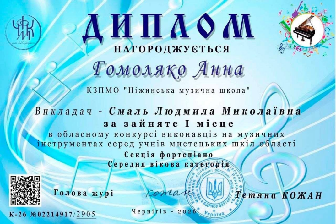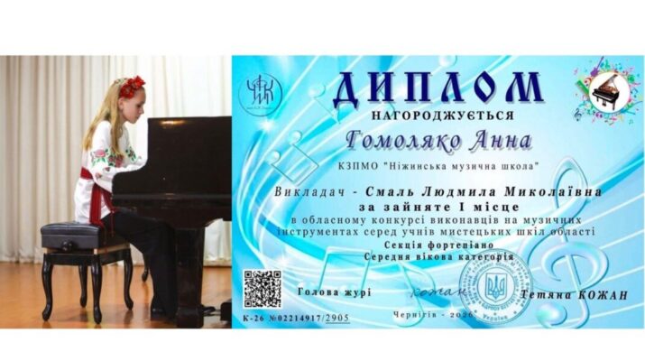 Талановита учениця мистецької школи Анна Гомоляко виборола І місце в обласному конкурсі виконавців на музичних інструментах серед учнів мистецьких шкіл області. Юна піаністка стала найкращою у секції фортепіано в середній віковій категорії, продемонструвавши високий рівень виконавської майстерності, музикальності та артистизму.