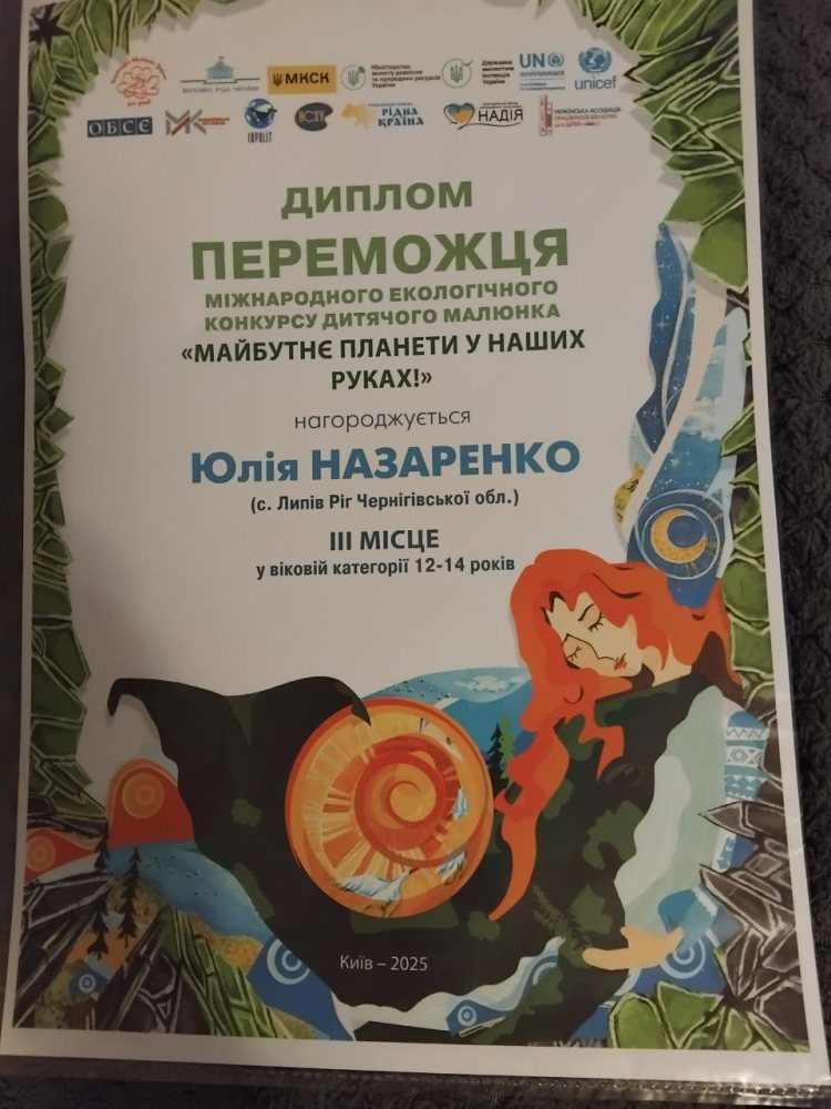 Цьогоріч на конкурс надійшло 4824 творчі роботи з усіх куточків України, а також із Молдови, Румунії, Німеччини, Італії та Іспанії. Серед переможців — Юлія Назаренко з села Липів Ріг, представниця Липоворізької бібліотеки. Її малюнок вразив журі глибоким змістом і щирим поглядом на екологічне майбутнє нашої планети.