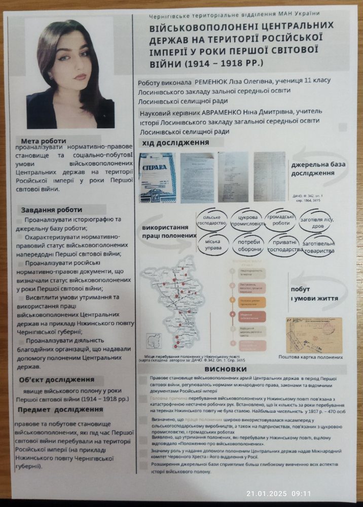 У даному Конкурсі, в науковому відділенні Історія (Всесвітня історія), взяла участь учениця 11 класу Лосинівського закладу загальної середньої освіти Ременюк Ліза (науковий керівник Авраменко Ніна Дмитрівна, учитель історії Лосинівського ЗЗСО). Ліза разом із Ніною Дмитрівною обрали тему: «Військовополонені Центральних держав на території Російської імперії у роки Першої світової війни». Захист пройшов на належному рівні.