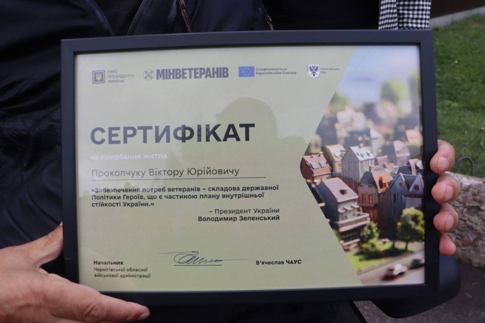 Ветеран війни з особливими потребами Віктор Прокопчук отримав сертифікат на придбання житла. Документ особисто вручили перший заступник голови Ніжинської районної військової адміністрації Інна Горобей, міський голова Лариса Осадчук, працівники відділу з питань ветеранської політики Ніжинської РДА та фахівець із супроводу ветеранів Віталій Дорошенко.