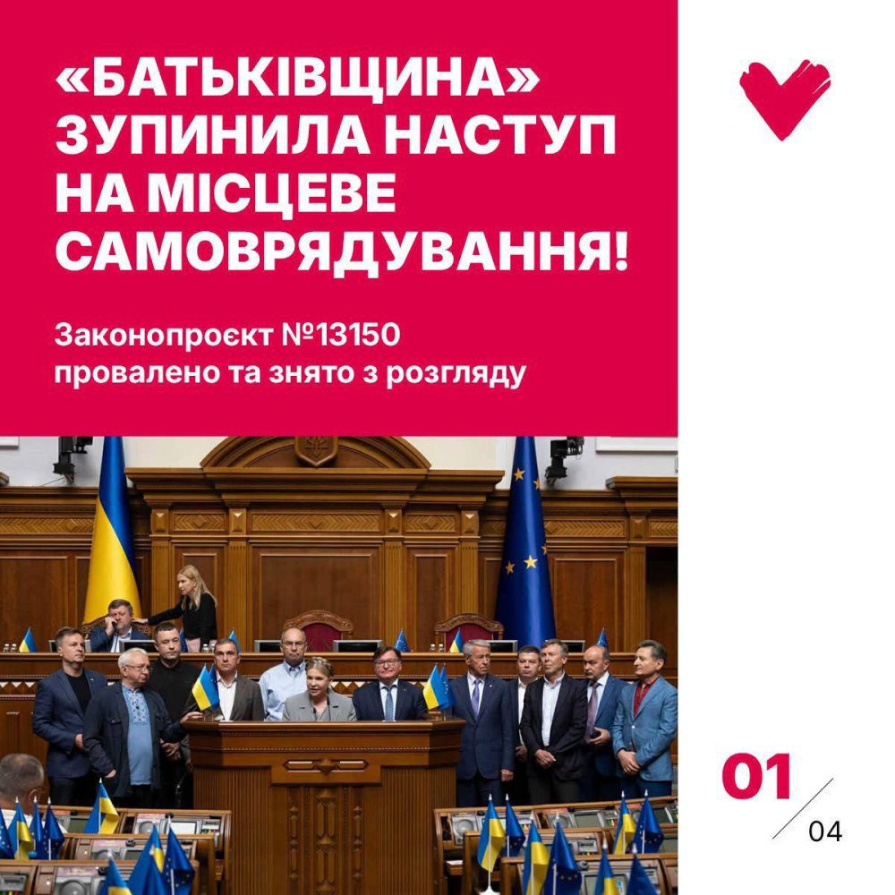 Завдяки зусиллям фракції «Батьківщина» зупинені наміри провладної більшості посилити в країні авторитаризм і позбавити місцеве самоврядування свободи в ухваленні рішень, а законопроєкт №13150 був «провалений» та знятий з розгляду.
